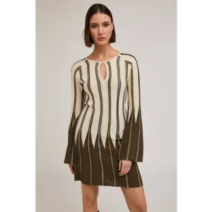 Motivi Pleated Effect Lurex Knit Striped Dress Military Green