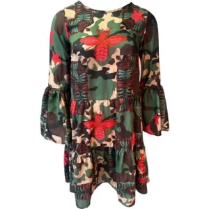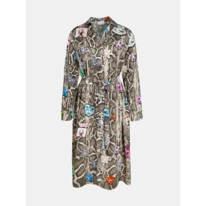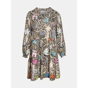 Mucho Gusto Zijden jurk lerici beige met slangenprint en kleurrijke broches