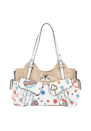 MYMO Schoudertas ‘Pop Eyetheme’ crème / duifblauw / lichtrood / zwart