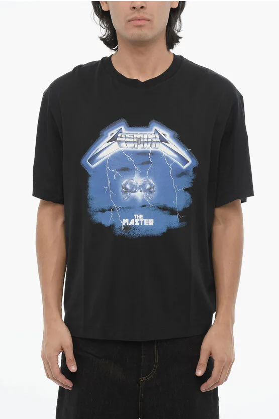 Slim Fit ROCK BAND ZODIAC GEMINI T-shirt met ronde hals en druppel in zwart