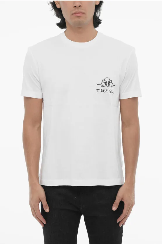 Katoenen slim fit I SEE YOU T-shirt met ronde hals in het wit