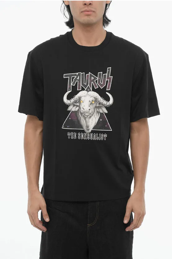 Slim Fit bedrukt ROCK BAND ZODIAC TAURUS T-shirt met ronde hals in zwart