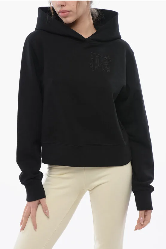 Geborstelde katoenen hoodie met geborduurde hoodie in het zwart