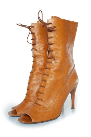 Prada bruine leren veterlaarzen met peep toe