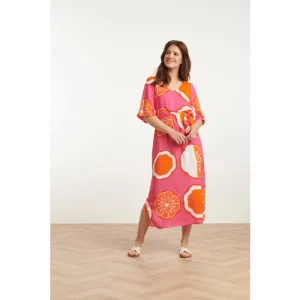 Smashed Lemon 25028 v-neck midi jurk met ballonmouwengrafisch fruitprint |