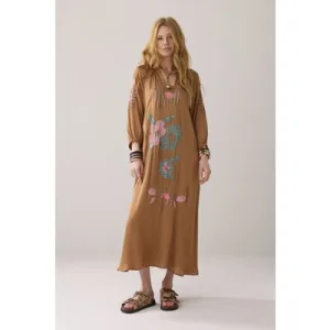 Summum Woman Dress Solid Satin Embroidered Peanut
