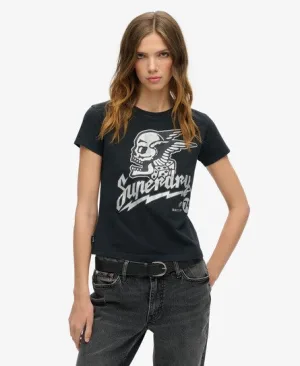 Superdry Vrouwen T-shirt met Versierde Posterprint en Aansluitende Pasvorm Zwart