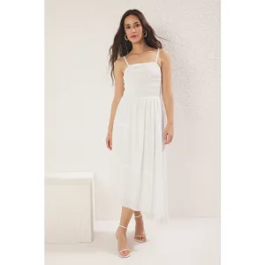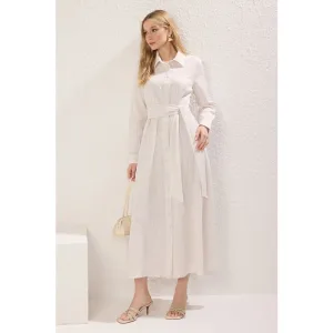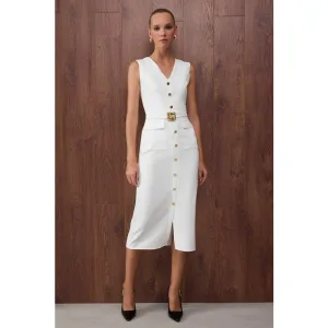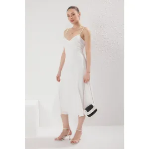 Ecrukleurige, rechte midi-jurk voor dames, geschikt voor overdag en ’s avonds.