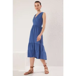 Damesjurk: effen blauwe midi-jurk zonder mouwen, casual model