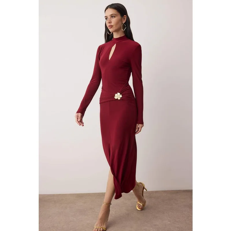 Damesjurken in bordeauxrood, recht model, maxi-lengte, stijlvol/geschikt voor een normale, bescheiden avond.