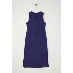 Marineblauwe, rechte, mouwloze midi-jurk voor dames, geschikt voor dagelijks gebruik.