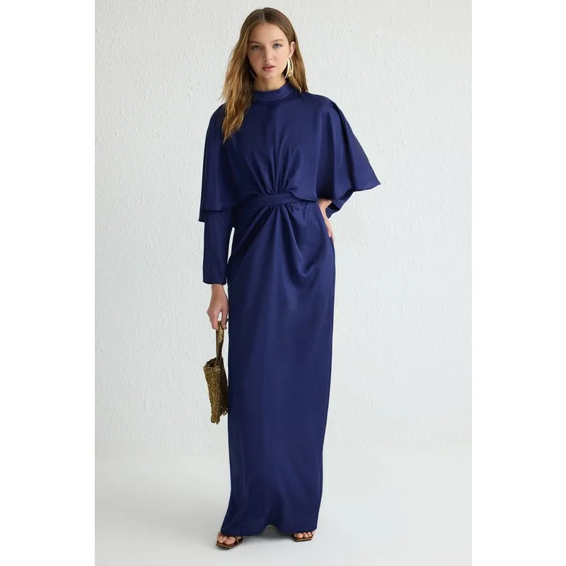 Marineblauwe effen lange casual avondjurken, normaal model, bescheiden