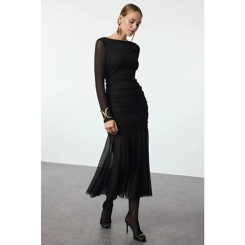 Dames Unifarben Midi Lange Cocktail Bodycon Jurk