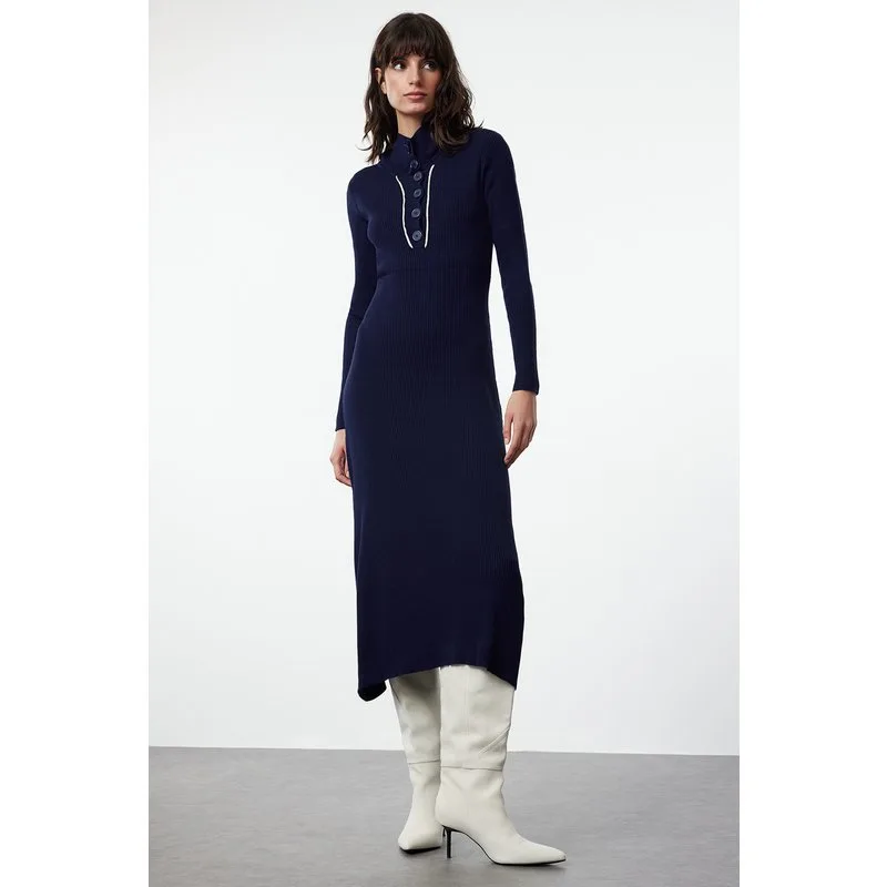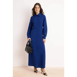 Marineblauwe rechte midi-jurk voor dames, lang, geschikt voor casual/dagelijks gebruik.