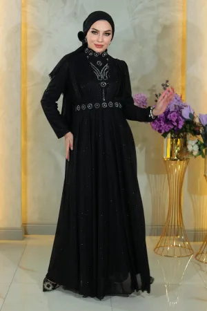 Steen Detailed Glitterend Chiffon Avondjurk Zwart