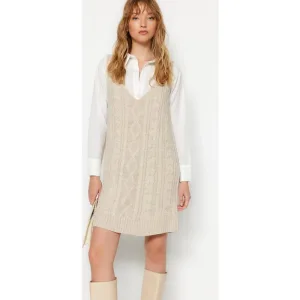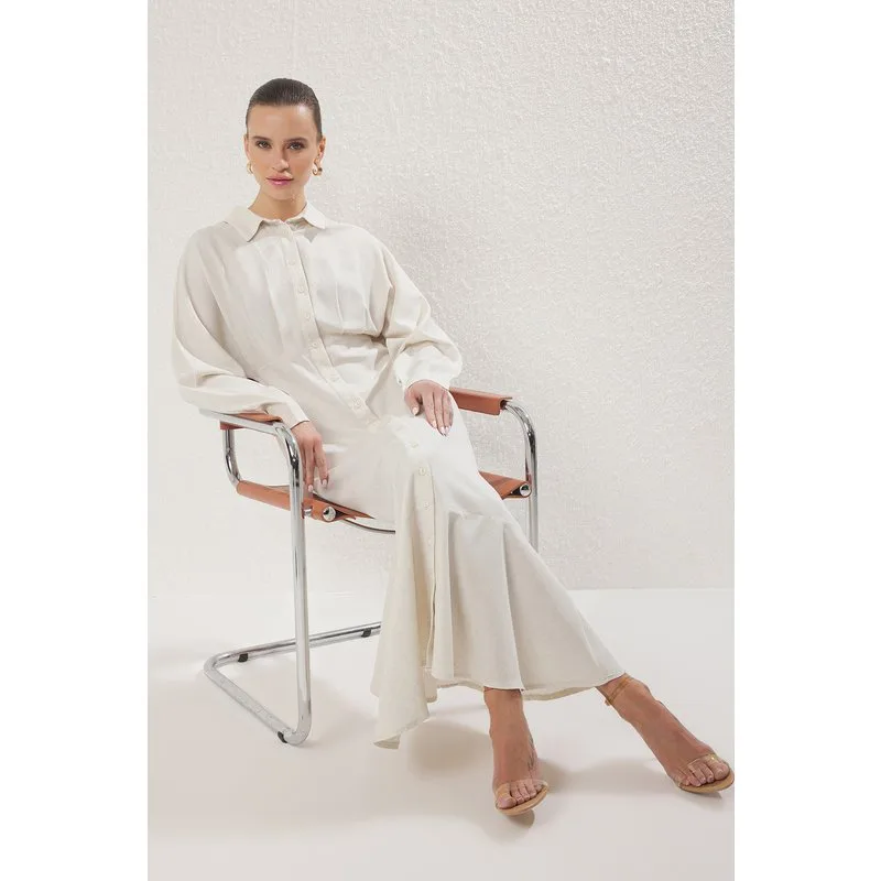 Beige damesjurk, rechte midi-lengte, casual/dagelijks, geschikt voor dagelijks gebruik.