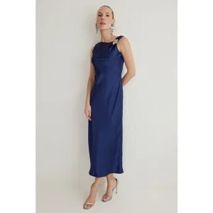 Damesjurk in marineblauw, effen midi-model met spaghettibandjes, stijlvol/naadloos model