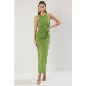 Groene, rechte, mouwloze midi-jurk voor dames, geschikt voor overdag en ’s avonds.