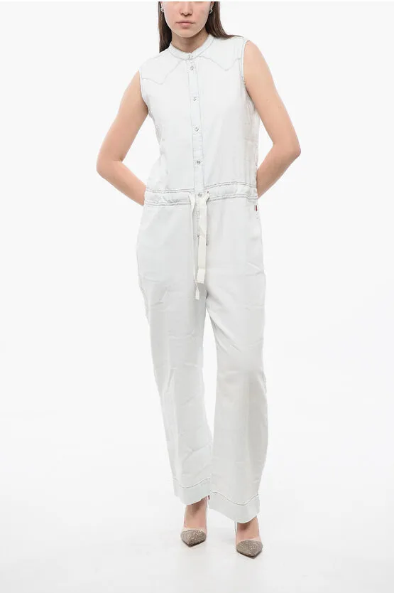 Mouwloze denim jumpsuit met trekkoord in de taille in wit
