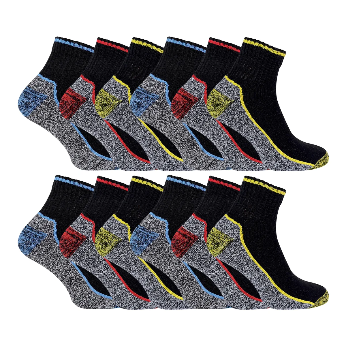 12 Pairs Korte Bamboe Werk Sokken: Profiteer van de ultieme bulkwaarde met onze kwart bamboe werk sokken. Met alle kenmerken van onze originele bamboe werk sokken, waaronder een gewatteerde voet, versterkte hiel en teen, en een hoog bamboe viscose gehalte, bieden deze sokken maximale ademendheid tijdens warm weer in de zomermanden. Deze enkelsokken van bamboe zijn perfect om de ademendheid te vergroten. De kortere lengte biedt de blootstelling die je benen nodig hebben tijdens warm weer, en het hoge bamboegehalte zorgt ervoor dat de sokken efficiënt vocht van je voeten en benen afvoeren. Bamboe als vezel staat bekend om zijn anti-geur eigenschappen, ideaal om je voeten droog te houden terwijl het een superzachte, comfortabele sok voor de drager biedt. Dit maakt de sok niet minder duurzaam, de dikke vulling door de sok en de versterkte hiel en teen zorgen hiervoor. Kies uit 3 maten en drie kleur opties in de verpakking.