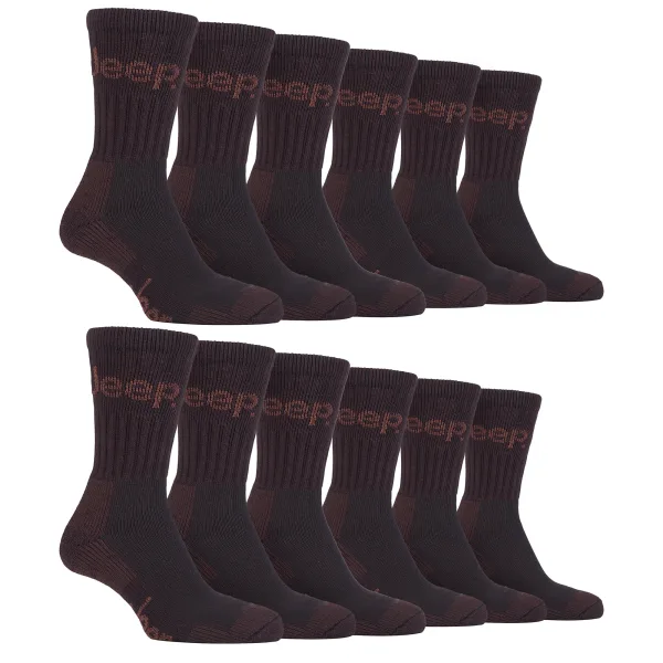 12 Paar Luxe Jeep Terrain Sokken voor Wandelschoenen - Sinds 1941 staat Jeep voor vrijheid en avontuur. Deze Jeep Terrain Sokken zijn ontworpen voor optimale prestaties in moeilijke omstandigheden en bieden uitzonderlijk comfort en duurzaamheid voor al uw buitensportactiviteiten. Gemaakt voor hiken, absorberen de gevoerde zolen van hiel tot teen schokken en voorkomen ze ongemak tijdens lange tochten. Gemaakt van een katoenrijke mix, voeren ze vocht af om de voeten droog en comfortabel te houden, terwijl de stevige, zware stof zorgt voor een lange levensduur op ruw en ongelijk terrein. Perfect voor wandelschoenen of dagelijkse avonturen, deze duurzame sokken zijn beschikbaar in vijf stijlvolle kleuren: Stone Beige, Zwart, Groen, Bruin en Marineblauw, en in UK maat 6-11. Met een samenstelling van 80% Katoen, 17% Polyester en 3% Elastaan bieden ze zachtheid, flexibiliteit en superieure ondersteuning. Extra productdetails: Jeep Terrain Sokken, 12 Paar, Gevoerde zool voor comfort, Katoenrijke stof voor vochtregulatie, Ideaal voor hiken en buitengebruik, Beschikbaar in 5 kleuren: Stone Beige, Zwart, Groen, Bruin, Marineblauw, UK maat 6-11, Samenstelling: 80% Katoen, 17% Polyester, 3% Elastaan, Duurzaam en langdurig, Perfect voor ruw terrein en wandelschoenen.