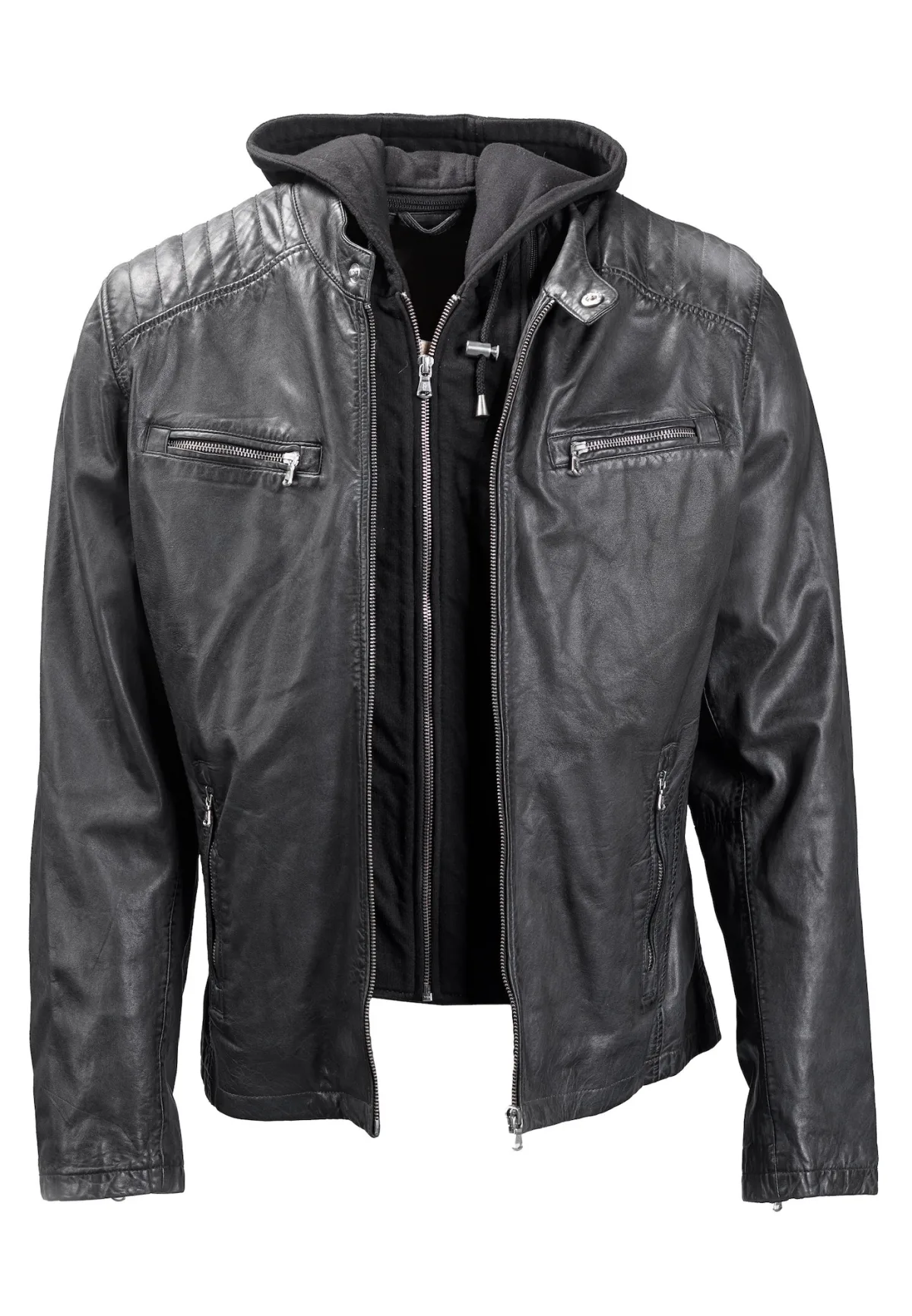 Design: Ritssluiting, Met capuchon; Type jas: Bikerjack; Voering: Licht gevoerd; Materiaal: Leer; Motief: Effen; Extra's: Buigzame grip; Pasvorm: Normale pasvorm