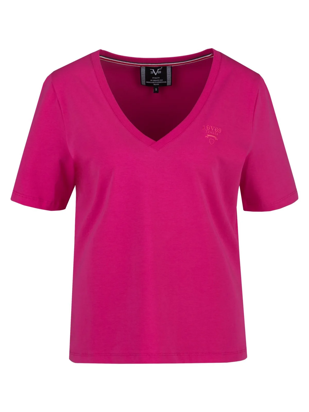 Eenvoudig T-shirt met V-hals en subtiel logoborduursel. De hoogwaardige katoen-elastaanmix zorgt voor een hoog draagcomfort en een perfecte pasvorm.