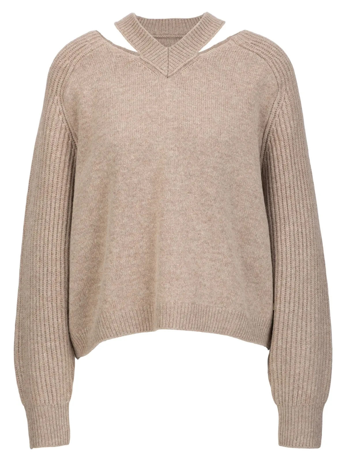 Design: Geribd ceintuurtje; Materiaal: Knitwear; Halstype: V-hals; Motief: Mélange; Details: Cut-outs; Pasvorm: Losse pasvorm; Armlengte: Lange mouw; Lengte: Normale lengte