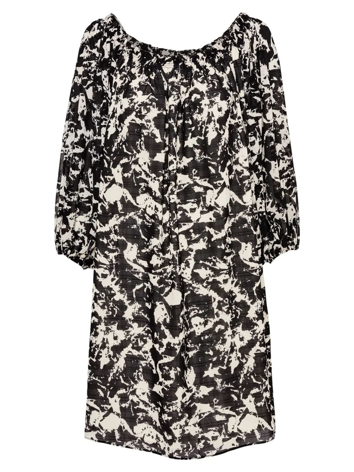 Design: Gevoerde zoom/rand, Elastische taille/zoom, Overige kragen; Halstype: Carmen hals; Motief: Bloemenprint; Details: Gedrapeerd; Extra's: All-over patroon, Gladde stof; Lengte: Kort/mini; Pasvorm: Losse pasvorm; Armlengte: Driekwart mouw