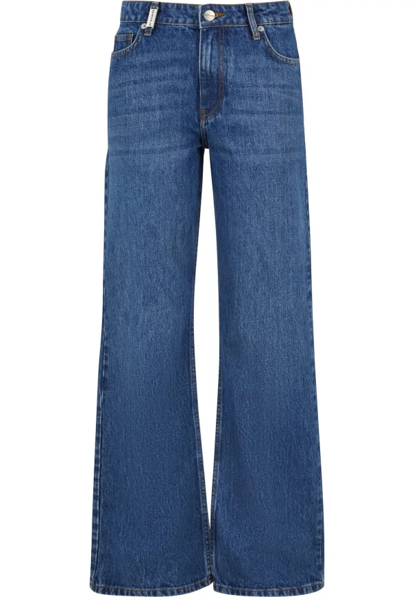 Design: Gevoerde zoom/rand, 5-pocket-style; Type sluiting: Ritssluiting; Materiaal: Denim; Motief: Effen; Extra's: Contrasterende naden, Riemlussen; Wassing: Rinsed/dark washed; Lengte: Lang/maxi; Pasvorm: Wide leg; Taillehoogte: Mid waist