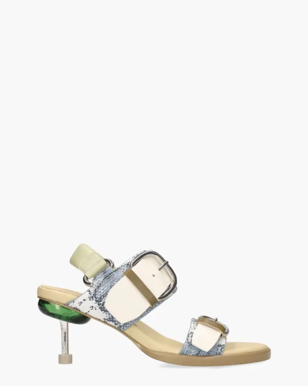 Sandalen voor dames Osha Line Mid uit de collectie van het Spaanse merk 4CCCCEES. Dit bijzondere model heeft een upper van wit leer gecombineerd met blauw en wit leder in een slangenprint. De hielband in padded mintgroen leer geeft de sandalen niet alleen een coole look maar zorgt ook voor draagcomfort. Het zachte voetbed is ook in