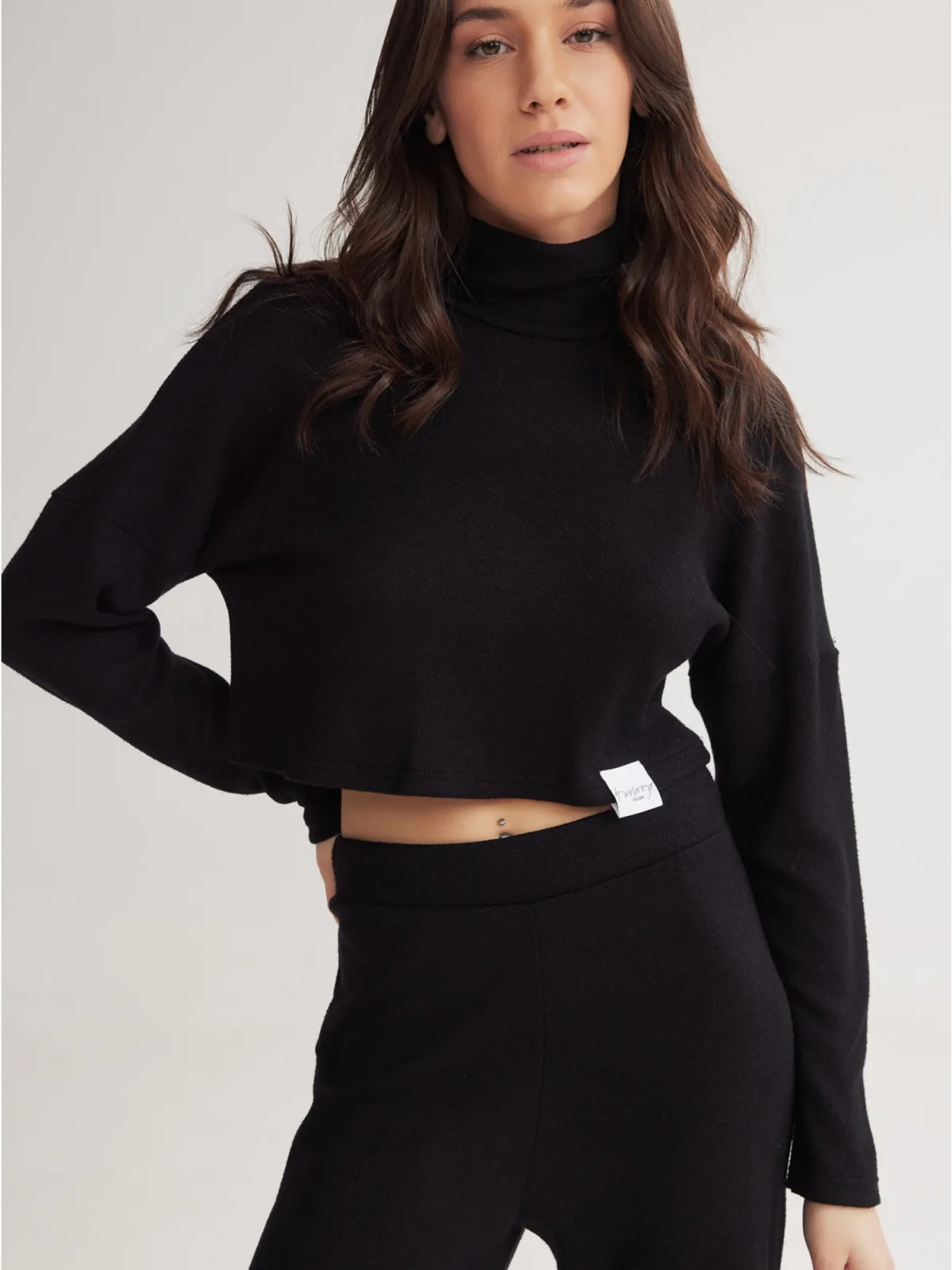 Design: Geribd ceintuurtje; Materiaal: Viscose; Motief: Effen; Extra's: Label patch/label flag, Op staal naden; Pasvorm: Losse pasvorm; Armlengte: Lange mouw; Lengte: Korte pasvorm