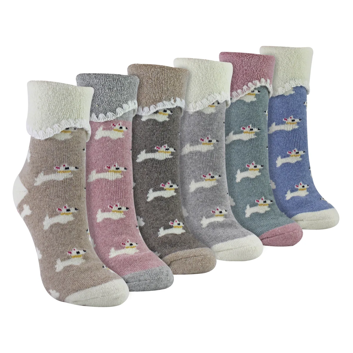 6-Pack Dames Wol Bed Sokken - Ontwerpen van Konijn, Hoogland Koe & Hond: Houd je voeten gezellig en warm met deze 6-Pack Dames Wol Bed Sokken, ontworpen voor ultiem comfort tijdens koudere nachten. Gemaakt van een zachte wolmix, bieden deze sokken uitzonderlijke warmte en ademend vermogen, zodat je voeten snugger blijven zonder te oververhitten. De verpakking bevat zes paren sokken in schattige patronen met ontwerpen van een Konijn, Hoogland Koe en Hond - perfect voor dierenliefhebbers of iedereen die houdt van leuke en gezellige sokken. Deze bed sokken zijn ontworpen met een zachte elastische bovenkant voor een veilige maar niet beperkende pasvorm, waardoor je de hele nacht comfortabel kunt zitten. Het wolrijke materiaal zorgt voor natuurlijke isolatie, helpt om warmte vast te houden terwijl het licht en ademend blijft. Ideaal om rond het huis te loungen of om aan te trekken voor het slapengaan, voegen deze sokken een vleugje warmte en plezier toe aan je nachtmode collectie. Of je nu jezelf verwent of op zoek bent naar een attent cadeau, deze 6-Pack Dames Wol Bed Sokken zijn de perfecte keuze. Verkrijgbaar in maat 4-8, bieden ze een comfortabele pasvorm voor de meeste voetgroottes. Hun zachte en gevoerde textuur garandeert ultieme warmte en ontspanning, waardoor ze een winteressential zijn. Extra Productdetails: Materiaal: Wolmix voor warmte Maat: 4-8 Ontwerpen: Konijn, Hoogland Koe, Hond Verpakking Grootte: 6 Paren Zacht, Warm & Gezellig Ideaal voor Bedtijd of Loungen Zachte Elastische Bovenkant voor Comfort Machinewasbaar