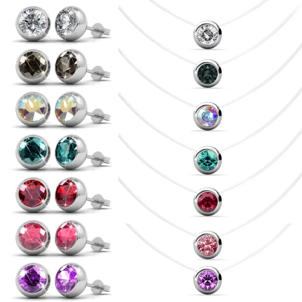 Samenstelling: Messing Afwerking: Rhodium-plated en nylon Soort steen: Oostenrijks kristal Aantal stenen (stuks): 21 Kleur steen: Multi Diameter oorbellen (mm): 5,2 Lengte ketting (mm): 400+50 Set van 7 paar oorbellen en kettingen: kristal, glanzend wit, rood, roze, paars, zwart en groen.