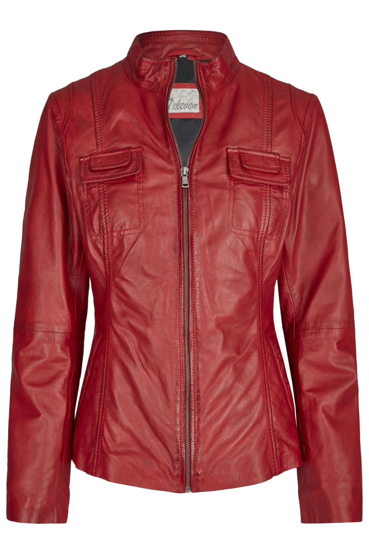 Design: Ritssluiting, Staande kraag, Getailleerd model, Deelnaden, Borstzak, Binnenzak, Opzet-/flapzak, Zakken aan de zijkant; Type sluiting: Ritssluiting; Type jas: Bikerjack; Voering: Licht gevoerd; Materiaal: Leer; Motief: Effen; Extra's: Op staal naden, Nappaleer, Lamsleer; Pasvorm: Aansluitende pasvorm