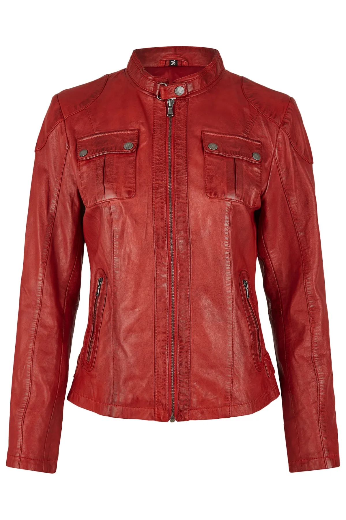 Design: Staande kraag, Borstzak, Ritszakken aan de zijkant; Type sluiting: Ritssluiting; Type jas: Bikerjack; Voering: Niet gevoerd; Materiaal: Leer; Motief: Effen; Pasvorm: Slanke pasvorm