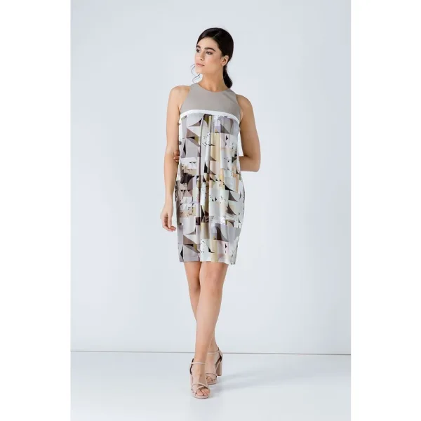Mouwloze jurk met een ronde halslijn. De bovenkant is van stretch beige gabardine dubbele stof en het onderste deel is van bedrukte jersey stof, rayon-elastaan. Tussen de twee zit een ecru horizontale strook. Sluit op de rug met 3 sierknopen. Drie plooien aan de voorkant. Opent onder de buste in een A-lijn silhouet. Ons model is 172cm en draagt maat 36/S. Afmetingen voor maat 36 (in cm): Schouder -23; Borst-44; Taille-47; Onderkant-57; Lichaamslengte-94.92%VISCOSE-8%ELASTANE