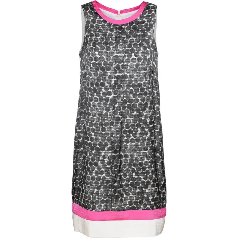 A-lijn jurk in een allover printstof, 100% viscose. Een ronde halslijn met een fuchsia bies van 2 cm. Mouwloos met een lichte racerback. Verborgen ritssluiting op de rug. 2 panelen aan de zoom: 4 cm breed in fuchsia en 7 cm breed in crème. Volledig gevoerd in stretchcrème. Lengte voor maat 38: 98cm.