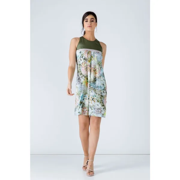 Mouwloze jurk met een ronde halslijn. De bovenkant is van stretch kaki gabardine dubbele stof en het onderste deel is van geprinte jersey stof, viscose-elastaan. Tussen de twee zit een roze horizontale strook. Sluit op de rug met 3 sierknopen. Drie plooien aan de voorkant. Opent onder de buste in een A-lijn silhouet. Ons model is 172cm en draagt maat 36/S. Afmetingen voor maat 36 (in cm): Schouder -24; Borst-44; Taille-47; Onderkant-57; Lichaamslengte-93.