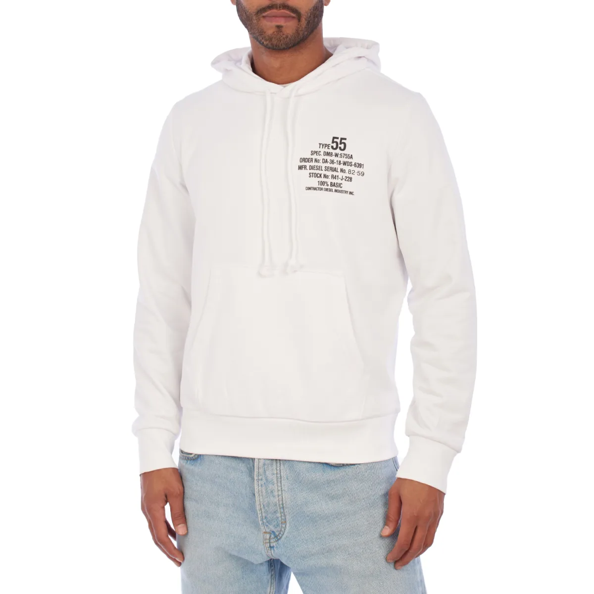 Diesel sweatshirt ontworpen voor een urban en moderne stijl, gemaakt van zachte katoenen stof die de hele dag comfort en warmte biedt. Met een normale snit biedt dit kledingstuk bewegingsvrijheid en past het goed bij verschillende lichaamstypes. De met trekkoordjes verstelbare capuchon voegt een extra laag bescherming toe voor koelere dagen, terwijl de kangoeroezak aan de voorkant ideaal is om kleine spullen in mee te nemen of je handen warm te houden. Hij heeft een moderne en opvallende stijl met een tekstdessin op de voor- en achterkant. Bovendien zorgen de getailleerde manchetten en zoom voor een betere pasvorm en helpen ze warmte vast te houden, waardoor dit sweatshirt een veelzijdige en praktische optie is voor zowel casual looks als ontspannen momenten. Het is de perfecte keuze voor wie op zoek is naar een comfortabel kledingstuk zonder stijl te verliezen. Samenstelling: 60% Katoen, 40% Polyester; Elastiek: 95% Katoen, 5% Spandex Onderhoud: - Machinewas max. 30ºC en zachtjes centrifugeren. - Vermijd het gebruik van bleekmiddelen. - Gebruik droger op lage temperatuur. - Strijken op lage temperatuur.