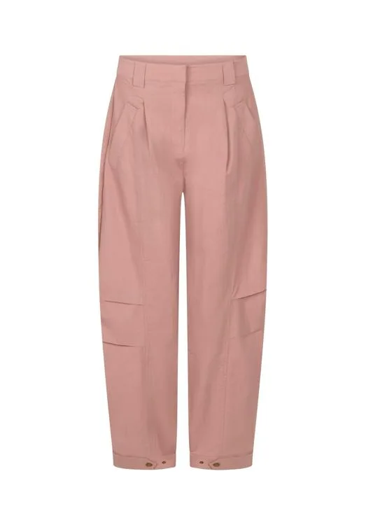 Deze broek van Aaiko is uitgevoerd in een soepele, middelzware geweven kwaliteit met een effen blushkleur. De hoge taille met riemlussen, geperste plooien en schuine steekzakken geven een clean silhouet. Op het been zorgen subtiele cargodetails voor een utility-touch. De pijpen lopen taps toe en de zoom is verstelbaar met drukknoopjes. De sluiting is een rits met haak & knoop voor een nette afwerking. Een veelzijdig kledingstuk voor Dames dat lang mooi blijft.