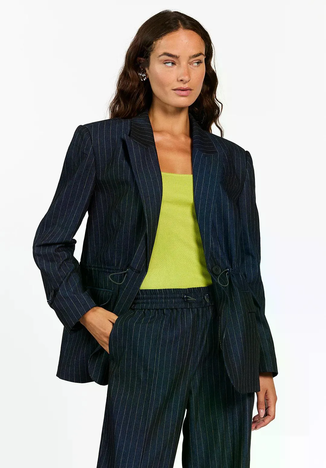 De Brynn Blazer heeft een recht model met een moderne pinstripe en sportieve details.Dankzij de elastische taille met koordsluiting kun je de pasvorm subtiel aanpassen, zonder dat het ten koste gaat van de strakke lijnen. De blazer heeft een klassieke reverskraag, knoopsluiting en klepzakken aan de voorkant. Draag ‘m los of als set met de bijpassende Esila broek.