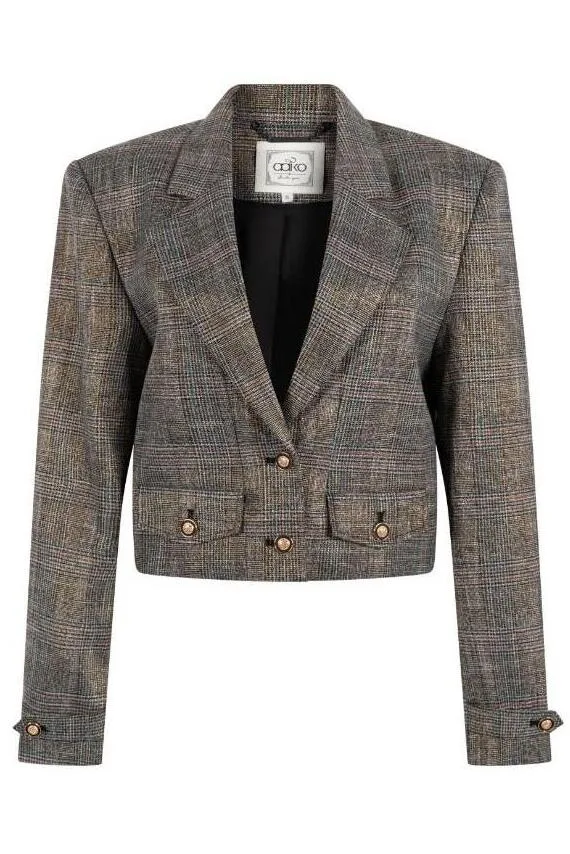 Maak kennis met de INES TWEED PES 540 van AAIKO, een stijlvolle korte blazer die elke garderobe verrijkt. De blazer heeft een gestructureerde stof met een glitterdraad. Tof aan dit model zijn de goudkleurige knopen en de siervakken.