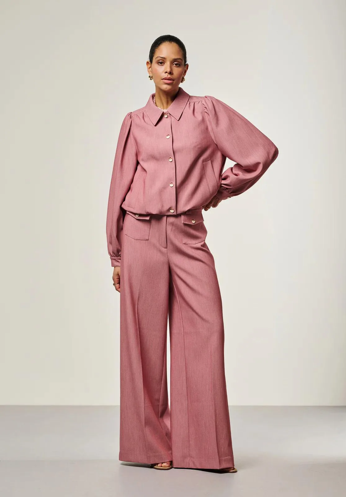 Blazer SANDY van Aaiko is een blazer met overhemdkraag, spreidkraag, knoopsluiting en lange mouwen met manchetten en knopen. De regular pasvorm en effen stof geven een rustige basis, terwijl de licht gepofte schouders opvallen. Combineer netjes met een pantalon of rok.