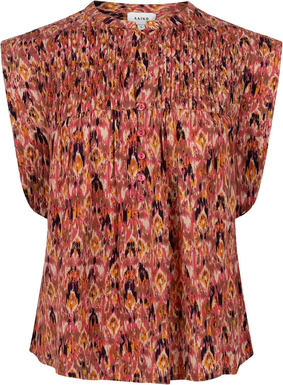 Top Sandra Ikat van Aaiko heeft een regular pasvorm en een split hals met knoopsluiting. Het grafische patroon geeft een speels accent. De mouwloze afwerking draagt luchtig en beweegt soepel mee. Combineer met een jeans of nette broek voor een casual outfit.