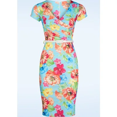Abigail Tropical pencil jurk in lichtblauw en multi