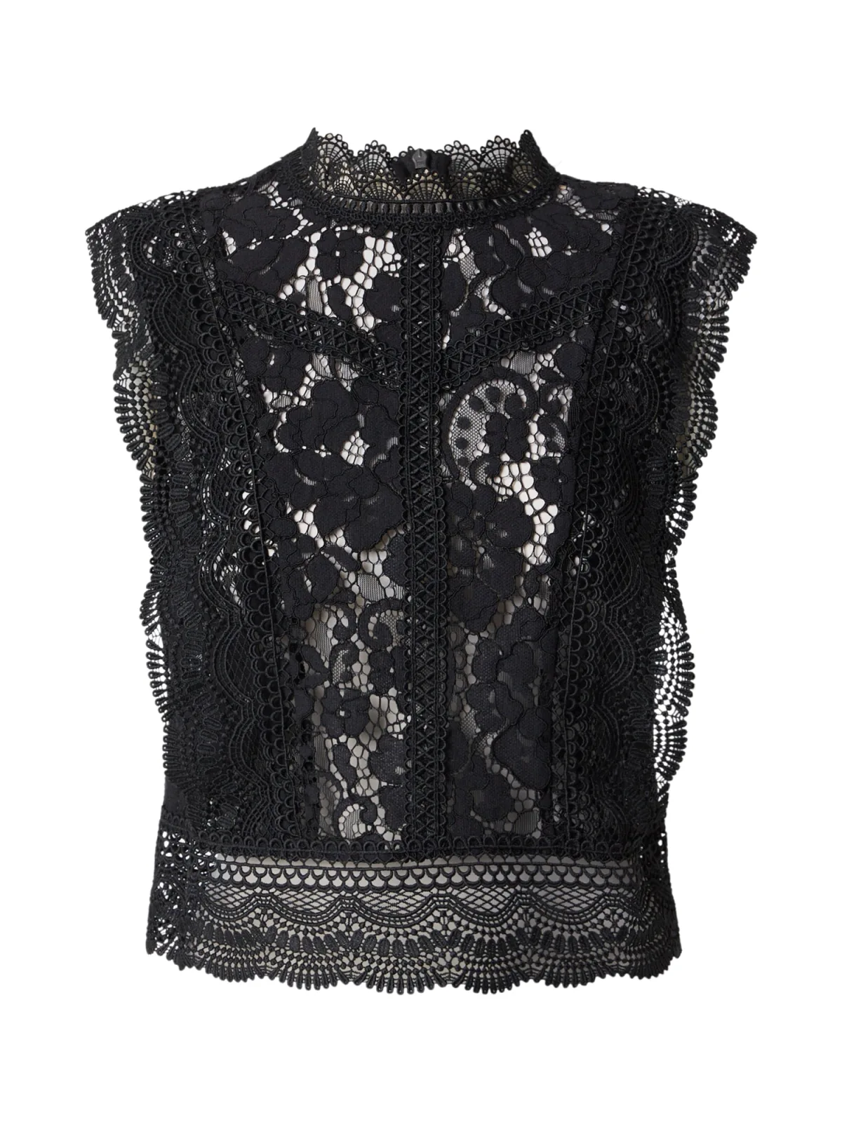 Blouse type: Blouseshirt; Design: Rug rits, Geschulpte zoom; Type sluiting: Ritssluiting; Materiaal: Katoen; Kraag: Opstaande kraag; Details: Kant; Extra's: Transparant, Met textuur; Pasvorm: Normale pasvorm; Armlengte: Mouwloos; Lengte: Korte pasvorm
