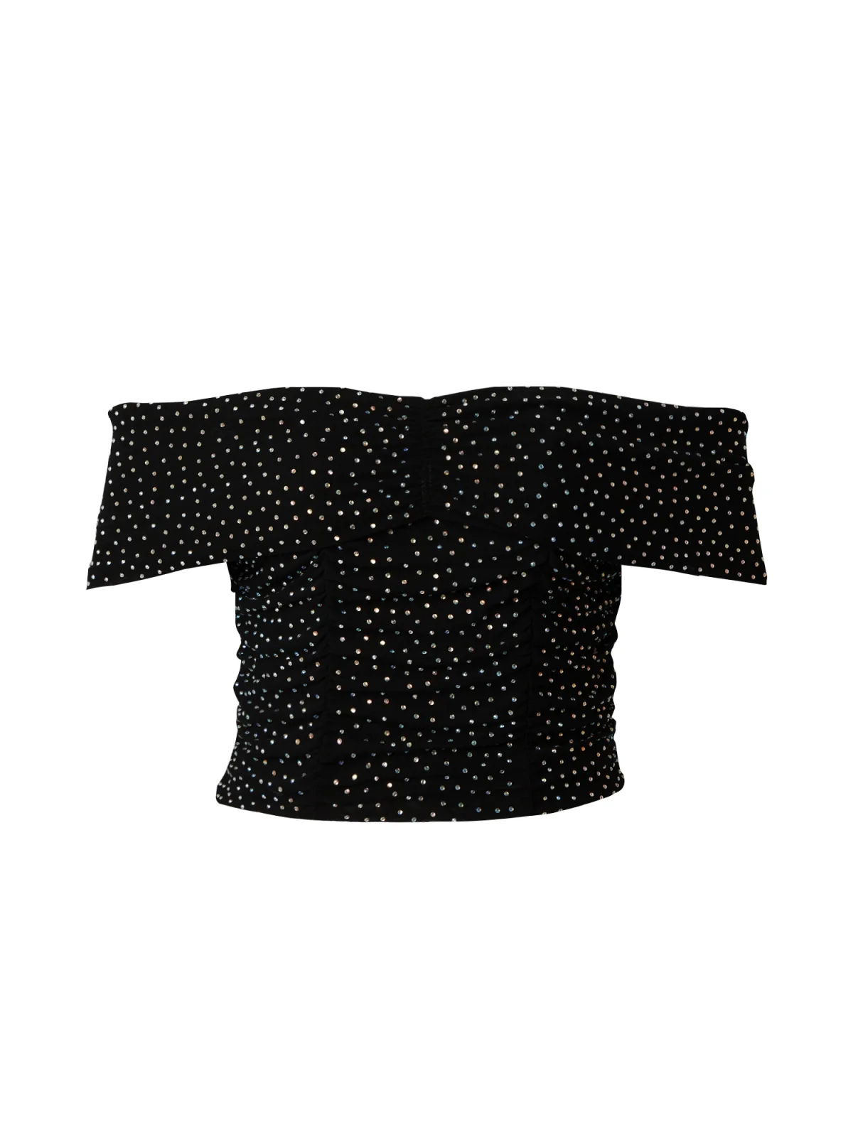 Design: Gevoerde zoom/rand, Strapless/off-shoulder; Materiaal: Jersey; Halstype: Carmen hals; Motief: Gestippeld; Details: Sierstenen, Gedrapeerd; Extra's: Glitterend, Op staal naden, Voelt zacht aan; Pasvorm: Aansluitende pasvorm; Armlengte: Kwartmouw; Lengte: Korte pasvorm