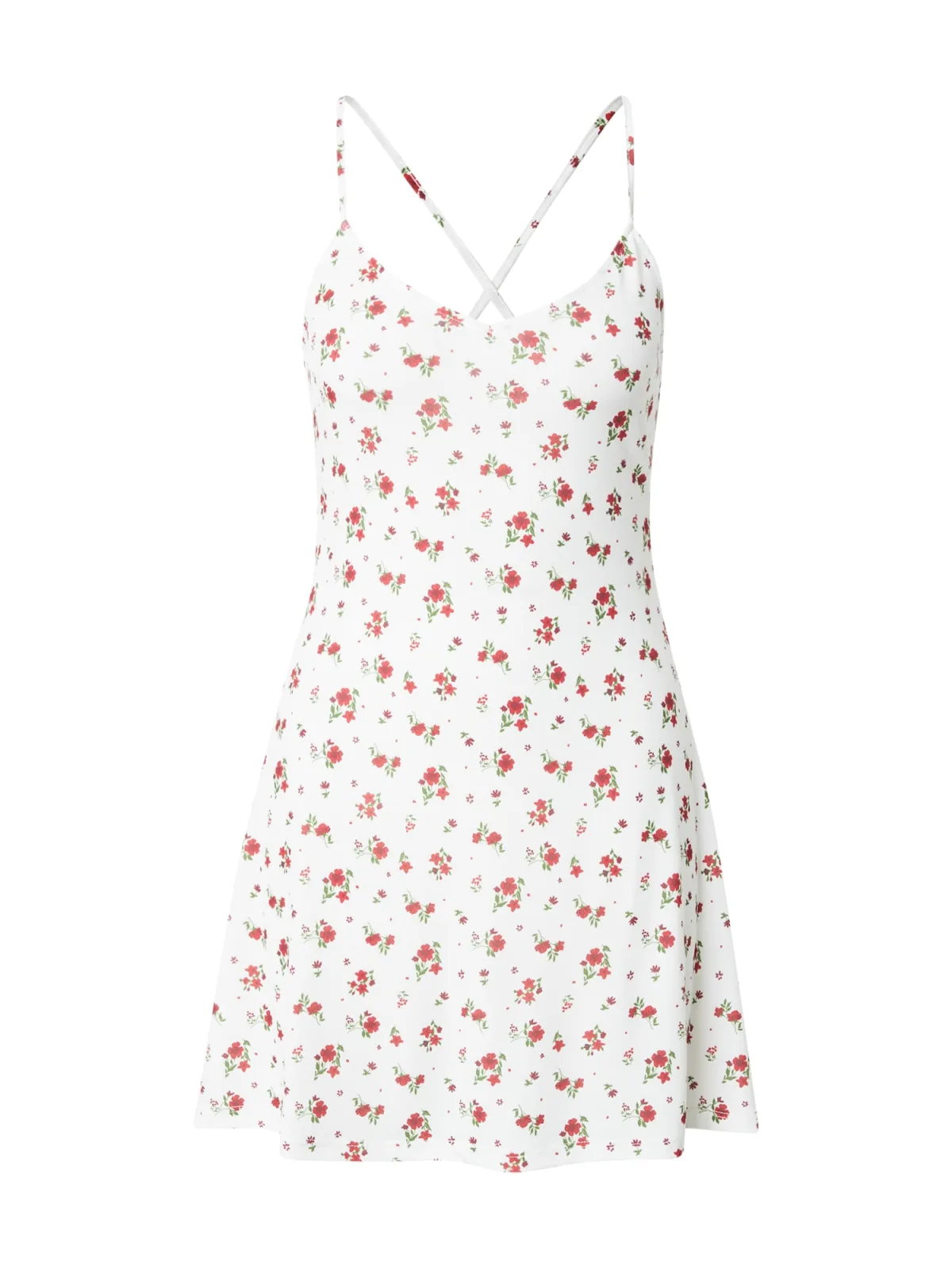 Design: Gevoerde zoom/rand, Diepe snit/decolleté; Halstype: V-hals; Motief: Bloemenprint; Extra's: All-over patroon, Gladde stof; Lengte: Kort/mini; Snit: Getailleerd; Pasvorm: Normale pasvorm; Armlengte: Mouwloos