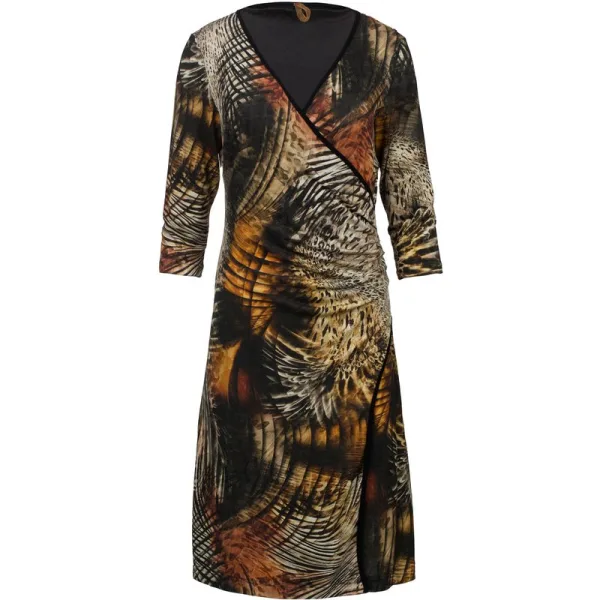 Jurk CONQUISTA in een gekruist silhouet van abstracte printstof met ¾ mouwen en effen bies bij de halslijn. Voering net achteraan en tot op de knie lengte. Het model is 1.77m en draagt maat 36/S. 92%viscose-8%elastan.